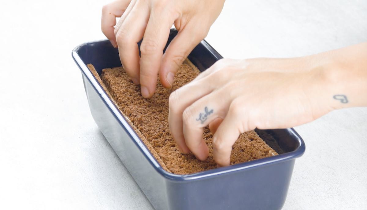 4. Verteile eine Schicht Schokomousse mit einem Löffel auf dem Kuchenboden. Streue dann die in Krümel gebrochenen Kuchenbodenreste auf die Mousse. Wiederhole das mindestens 2 bis 3 Mal, bis die Form gefüllt ist (abwechselnd Mousse und Krümel). Hebe aber noch ein bisschen Mousse für später auf. Zum Schluss kommt der Teigstreifen (der Boden) obendrauf. Drücke den Boden leicht an, sodass er von allen Seiten mit der Mousse bedeckt ist. Lege die Kuchenform nun für 3 Stunden in den Gefrierschrank.