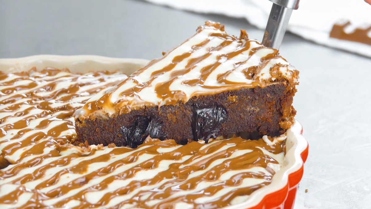4. Fülle die Hälfte des Schokoladenteigs in eine Kuchenform. Verteile dann die Brigadeiros darauf und bedecke sie mit der zweiten Hälfte des Schokoladenteigs.