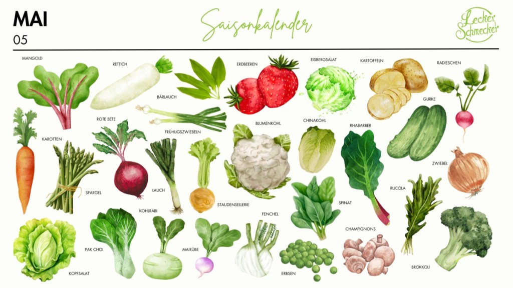 Eins ist klar: Im Mai wird die Auswahl an Obst und Gemüse aus heimischem Anbau wieder größer. Nach einem langen Winter wird das Angebot wieder bunter und abwechslungsreicher. Nun stehen wieder Gemüsesorten wie Radieschen, Salate, Kohlrabi oder Spargel auf dem Speiselan. Neben Freilandgemüse gibt es außerdem Sorten, die noch geschützt im Gewächshaus oder unter Folie wachsen. Aber egal ob Erdbeeren, Spargel oder Rhabarber, der Mai verwöhnt uns mit einem großen Bandbreite an frischen Lebensmitteln, die regional angebaut werden und nur kurze Transportwege zurücklegen müssen, um bei uns auf dem Tisch zu landen.