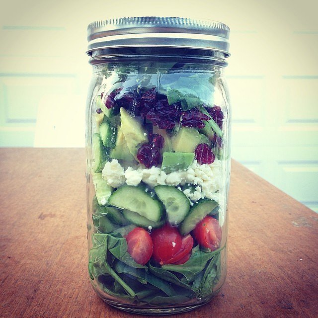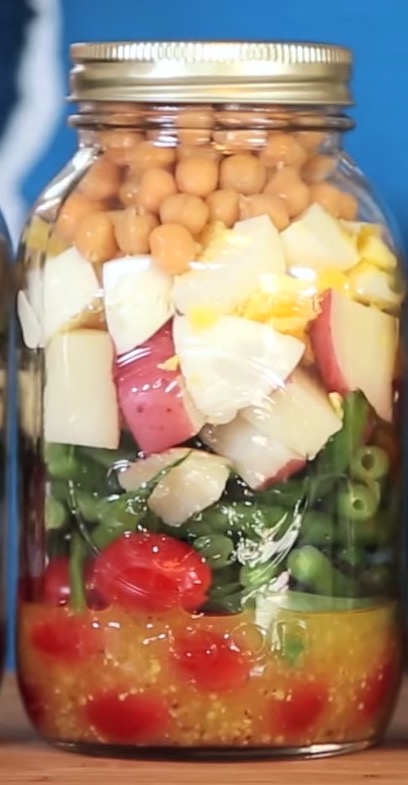- 4. Zuletzt das Eiweiß: Zutaten wie Tofu, Hähnchen oder Käse kommen ganz zuoberst ins Glas. Die schweren Zutaten helfen auch, den Salat und das Gemüse zusammenzupressen, so dass du das Glas noch weiter auffüllen kannst. Dann ab damit in den Kühlschrank.
