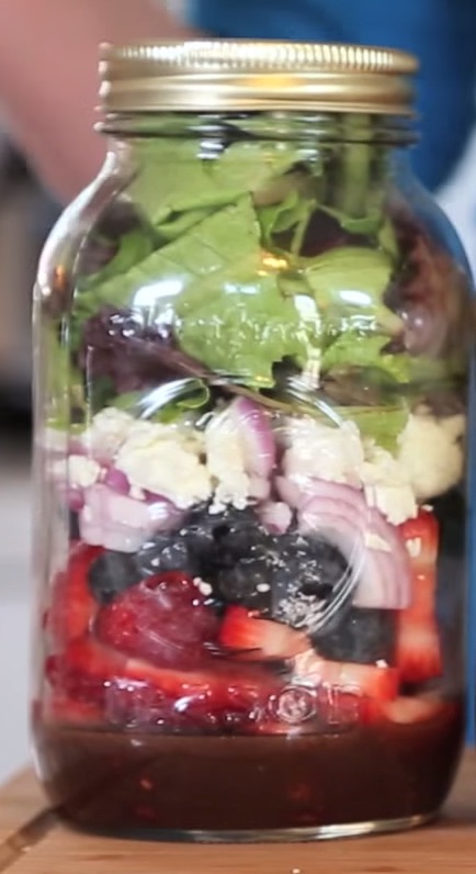 Obst gibt deinem Salat noch das gewisse Extra. Für diese fruchtige Variante gibst du Erdbeeren und Blaubeeren zu Walnüssen, Zwiebeln, Ziegenkäse und Blattsalat ins Glas. Zu den Erdbeeren passt am besten ein Balsamico-Dressing.
