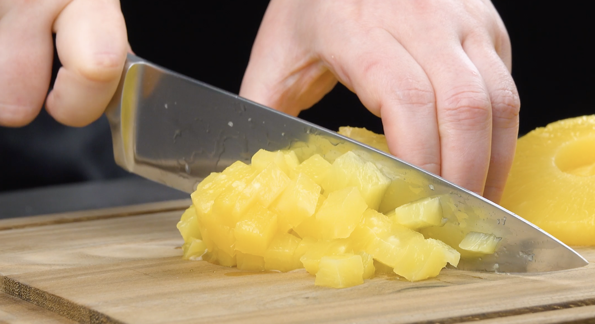 2.) Schneide außerdem die Ananas in kleine Würfel.