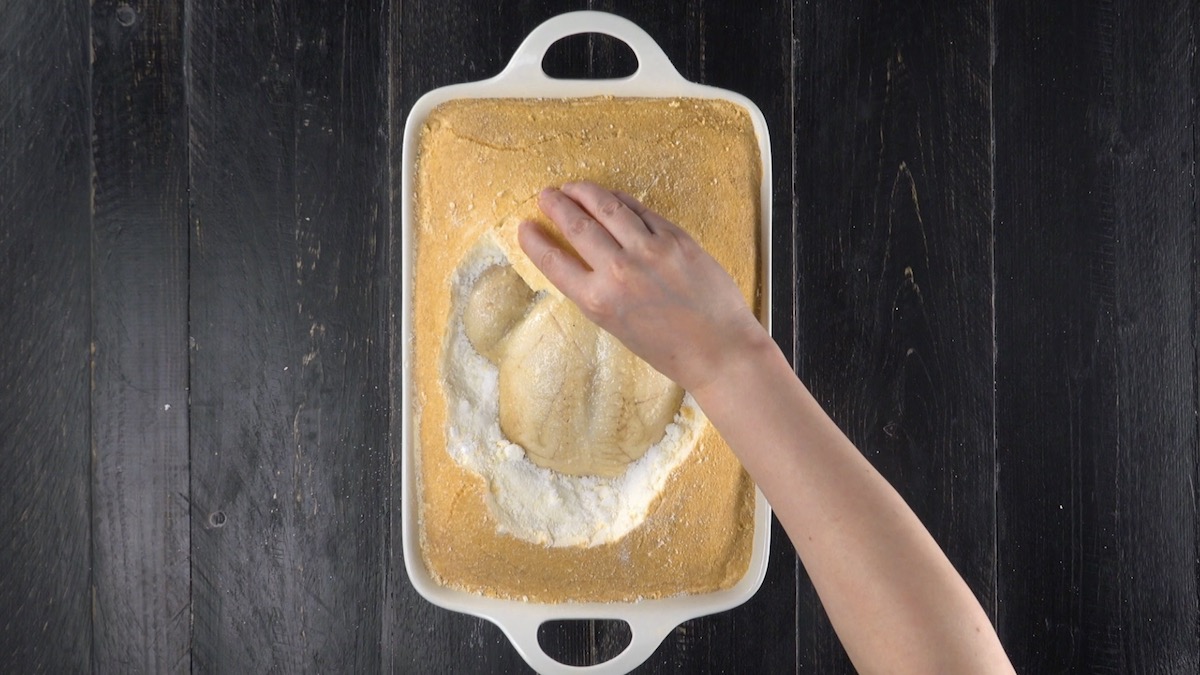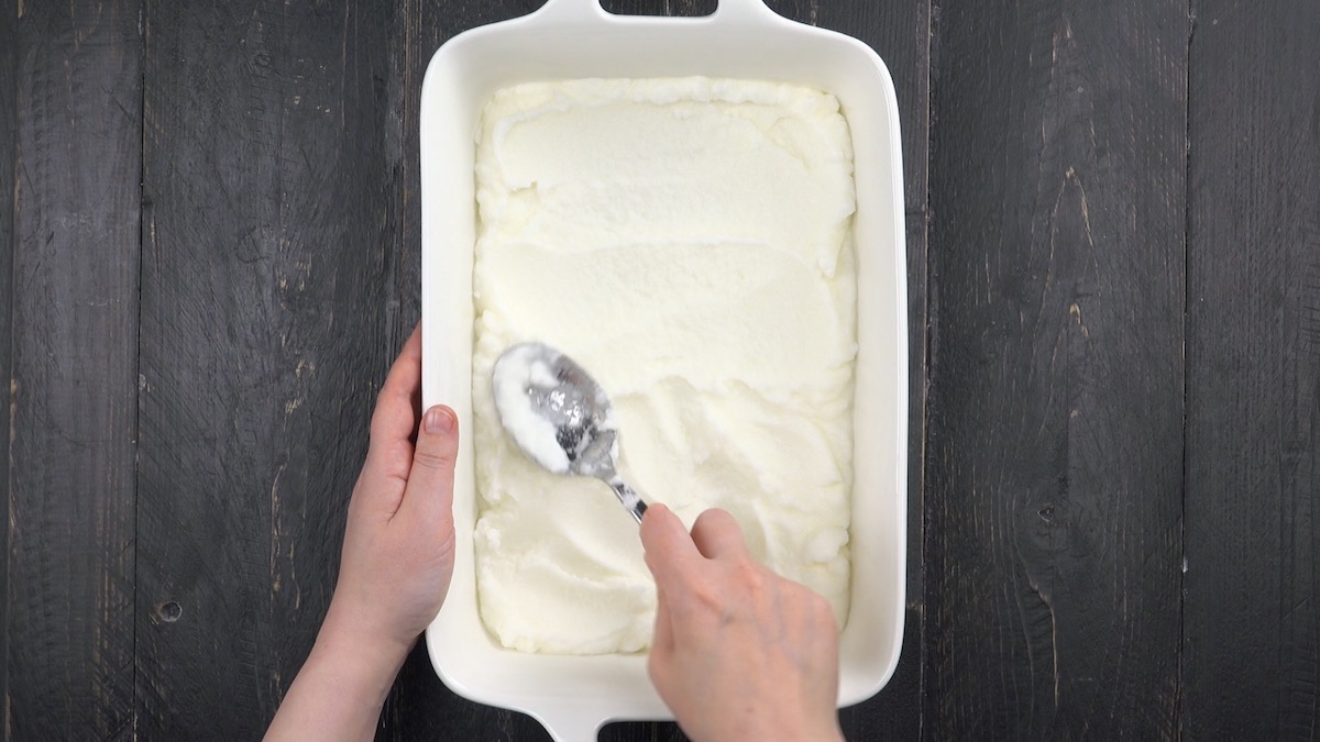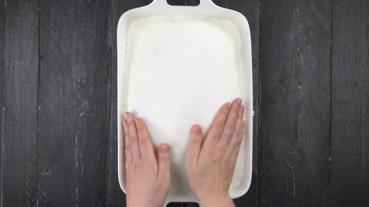 2.) Verrühre das Salz mit den 10 Eiweiß und gib etwa die Hälfte davon in eine Auflaufform.