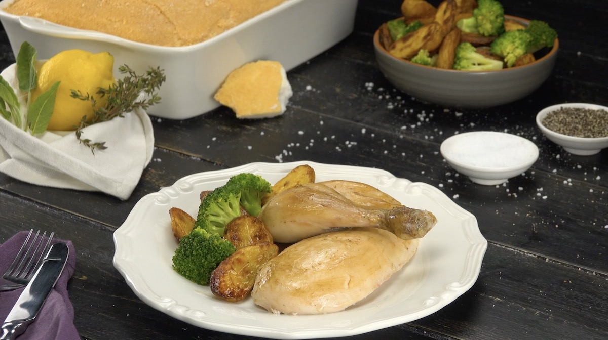 6.) Wir empfehlen, das Hähnchen zusammen mit Kartoffeln und Brokkoli zu servieren.