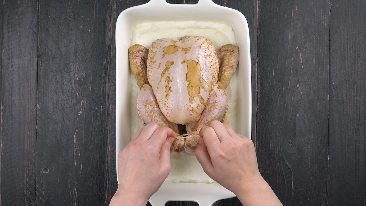 4.) Bedecke das gefüllte Hähnchen nun komplett mit dem restlichen Salz.