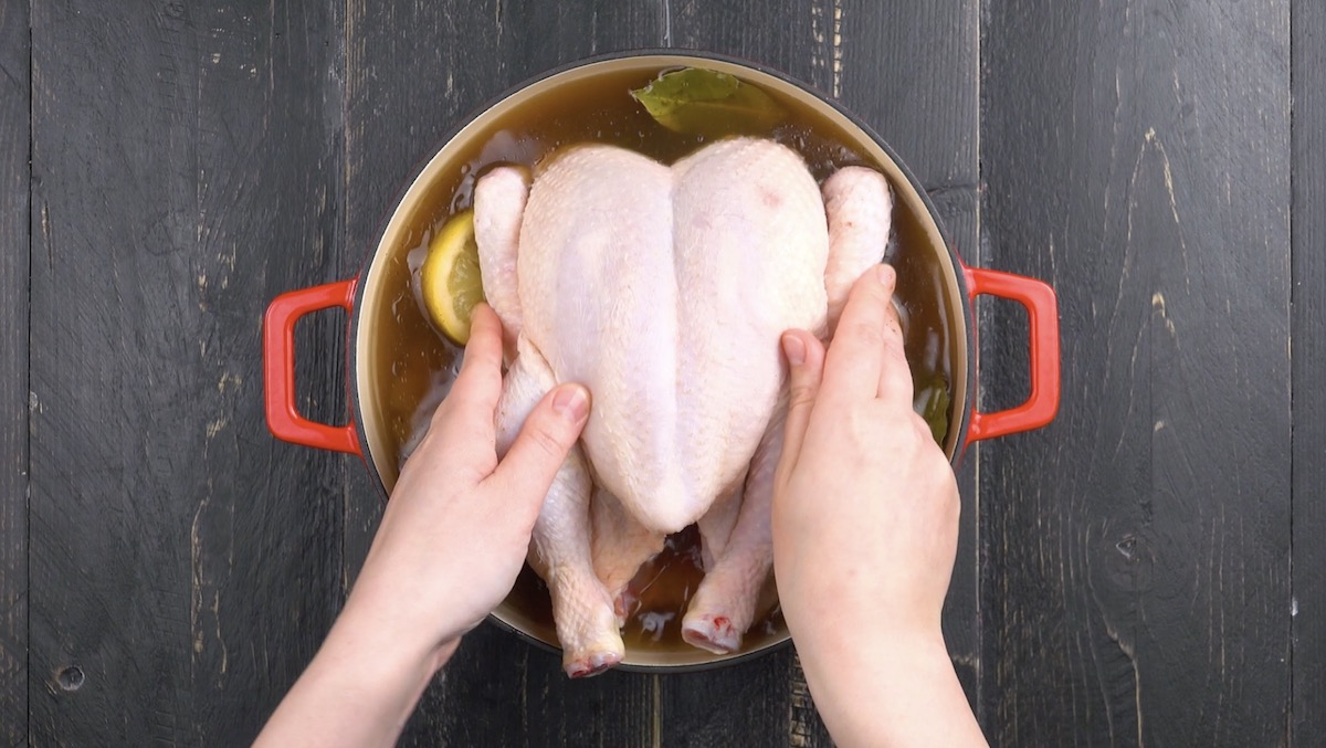 1.) Zunächst solltest du die Marinade zubereiten: Gib dafür alle Zutaten in einen Topf und koche sie auf. Lass die Marinade dann abkühlen. Lege dann das Hähnchen hinein und lass es für vier Stunden abgedeckt in dem Fond ziehen.