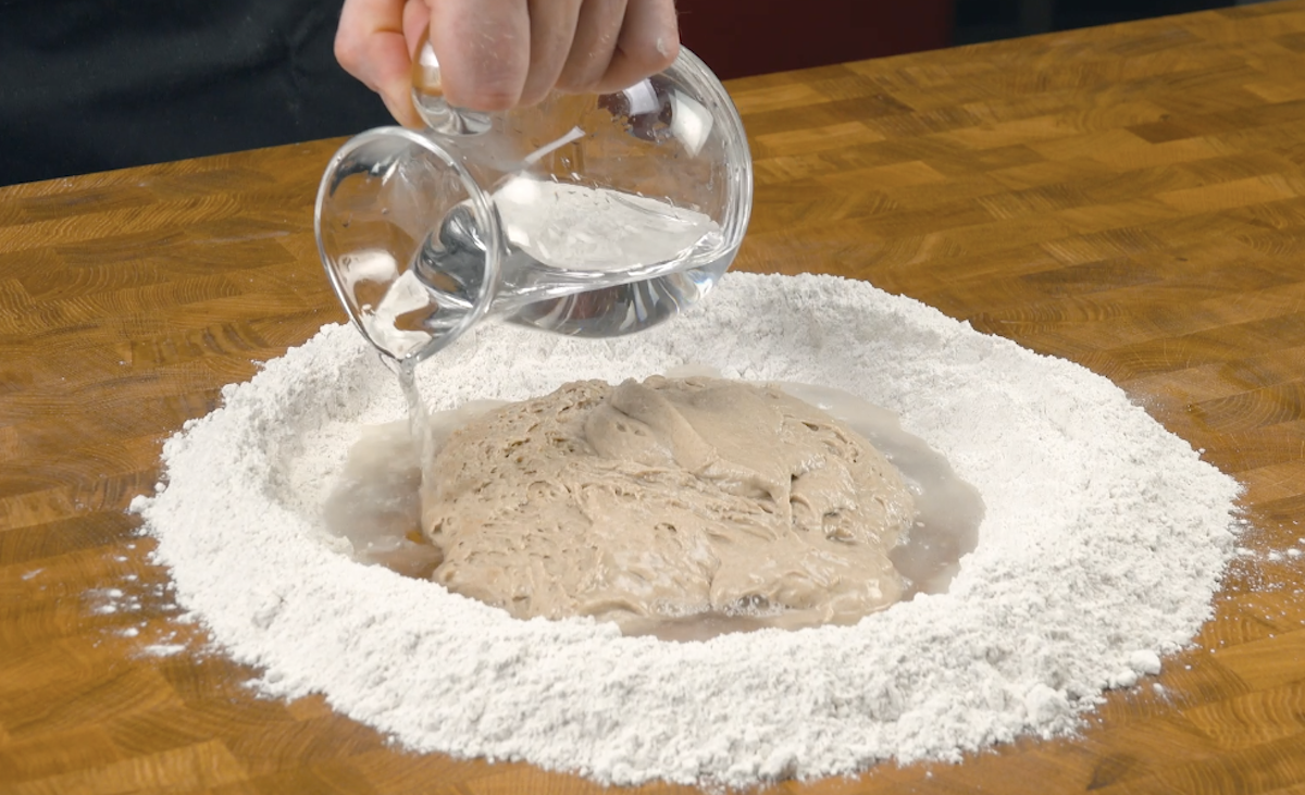 2. Gib den Sauervorteig und 250 g warmes Wasser sowie Salz hinzu.