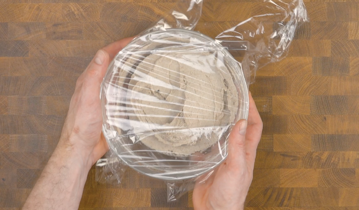 Rühre den Teigansatz mit einem kleinen, sauberen Teigschaber durch und decke ihn locker zugedeckt für 12 Stunden an einen warmen Ort.