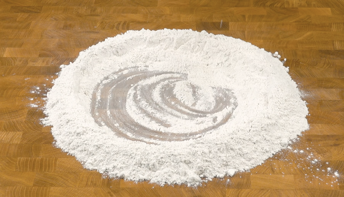 1. Gib 500 g Roggenmehl auf eine Arbeitsfläche und forme in der Mitte mit deiner Hand eine Kuhle.