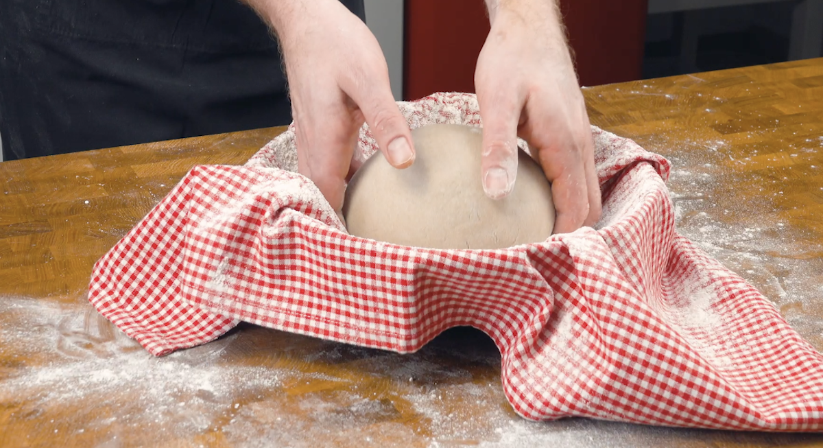 3. Verknete alles zu einem klebrigen Teig. Lasse den Teig ca. 20 Minuten ruhen und knete ihn danach nochmals durch. Forme ihn zu einem runden Laib und lege ihn in eine mit einem Tuch ausgelegte und mehlierte Schüssel. Lasse den Teig etwa 3 Stunden lang an einem warmen Ort gehen.