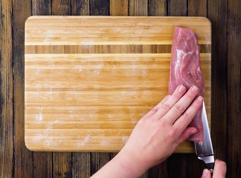 Zuerst salzt und pfefferst du großzügig das Schneidbrett. Wälze anschließend das Filet in den Gewürzen und schneide mit einem scharfen Messer längs einen tiefen Einschnitt in das Fleisch, damit du es aufklappen kannst.