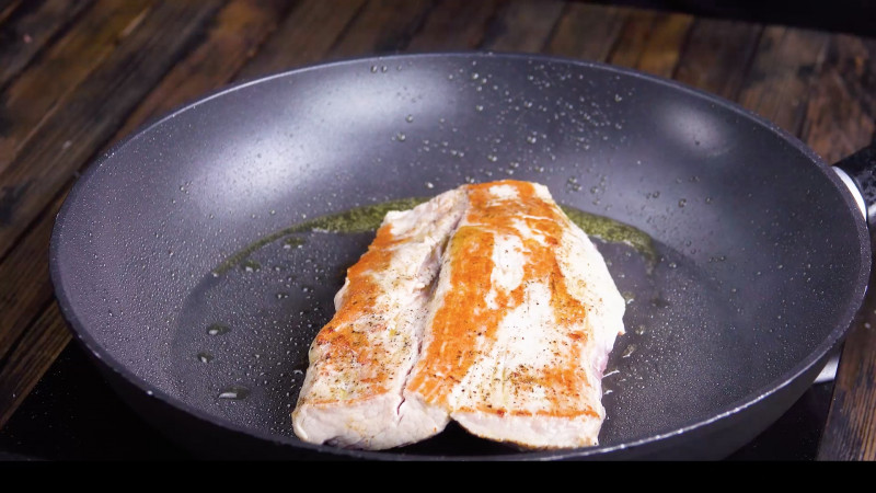 Würze das Schweinefilet auf beiden Seiten nun noch mit Salz und Pfeffer und brate es kurz in etwas Öl scharf an, nimm es aus der Pfanne und lass es etwas abkühlen.