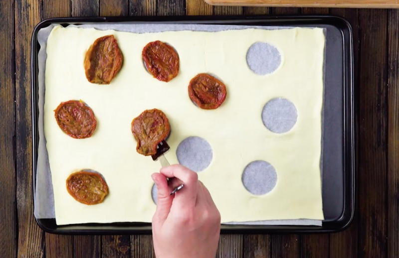 Rolle nun den Blätterteig auf einem mit Backpapier ausgelegten Backblech aus und stich mit runden Ausstechformen oder einem Glas 11 Kreise heraus. Lege auf jedes Loch eine Tomate.