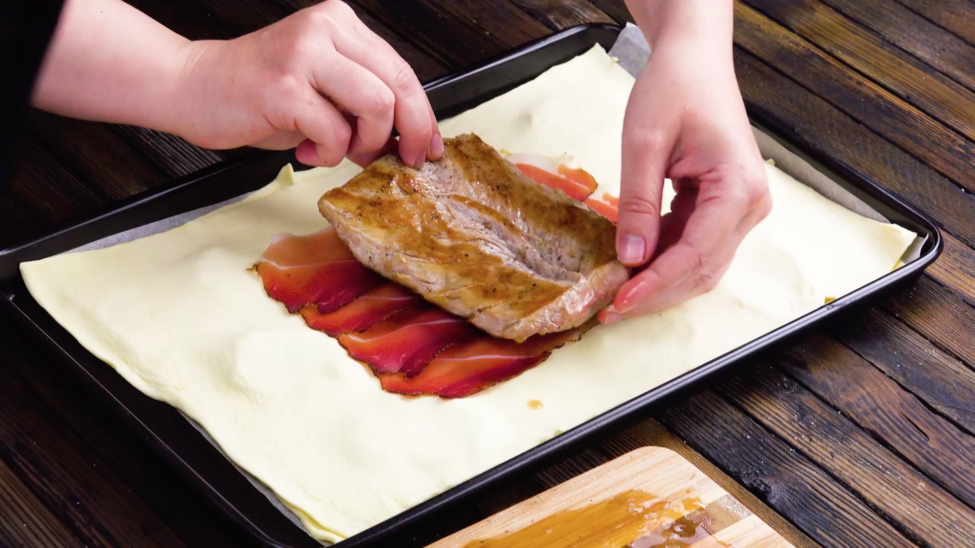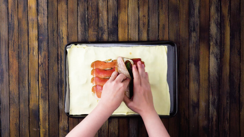 Breite darauf den zweiten Blätterteig aus und drücke ihn entlang des Rands leicht an. Lege nun die 4 Scheiben Schinken längs in die Mitte des Teigs, sodass sie sich dabei teilweise überlappen. Darauf kommt quer in die Mitte das Filet.