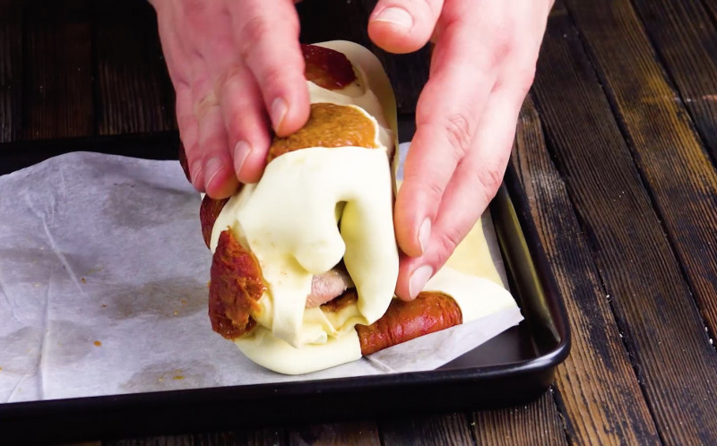 Schlage nun erst die kurzen Seiten des Teigs nach innen und rolle den Teig dann auf.