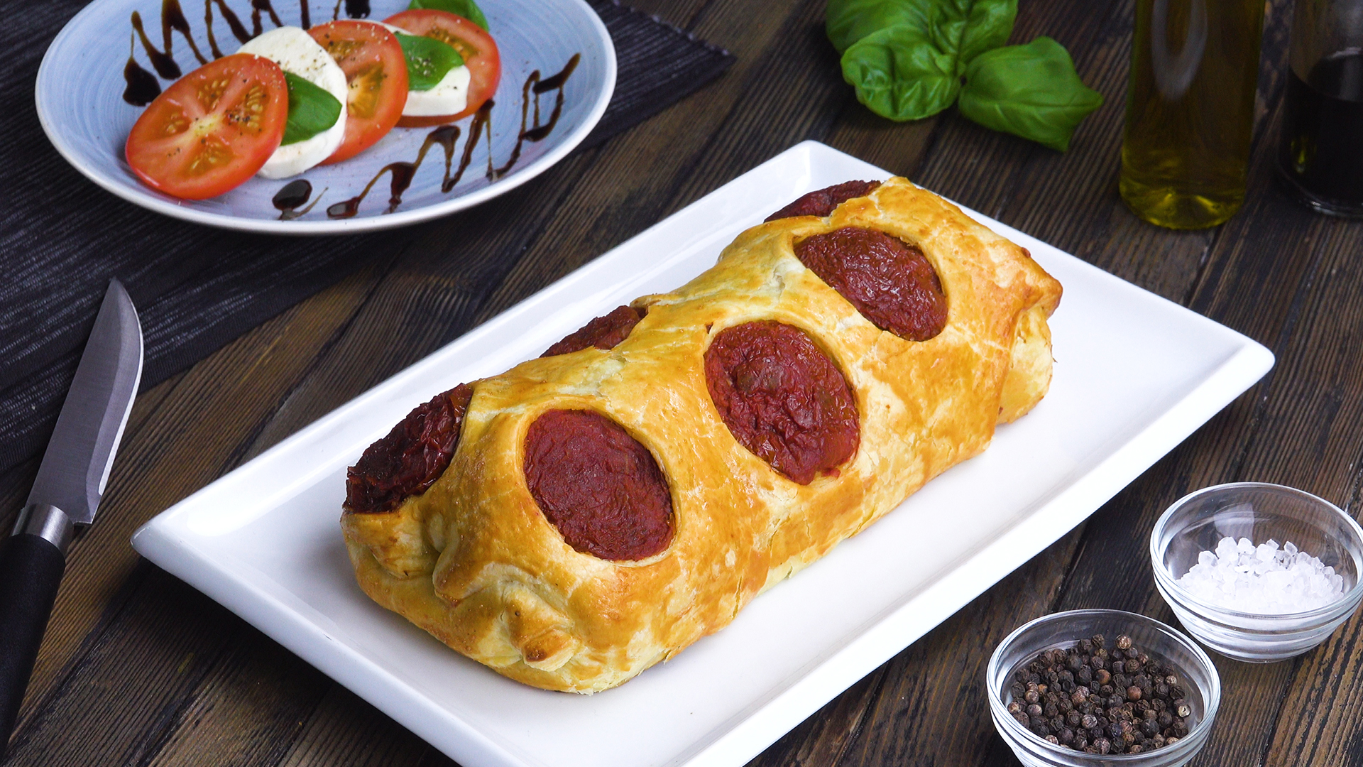 Falls du dich als Erstes fragst, was genau eigentlich ein „Filet Mignon“ ist: Es handelt sich um die Filetspitze, d.h. das schmale, vordere Ende des Filets. Und das Besondere daran ist, dass es noch saftiger und zarter ist als herkömmliches Filet. Das klingt verlockend, oder? Noch verlockender ist es, das gute Stück nach folgendem Rezeptvorschlag zuzubereiten – mit zartschmelzendem Mozzarella, würzigen eingelegten Tomaten und in üppigem Blätterteiggewand.
