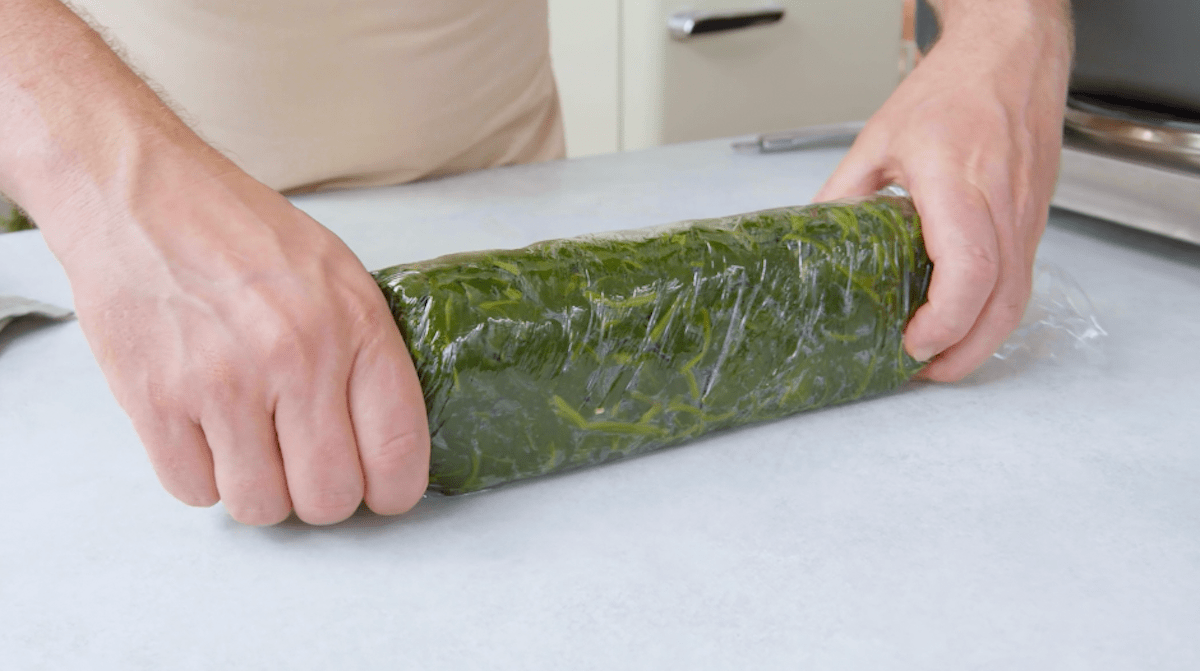 3. Lege ein großes Stück Frischhaltefolie auf die Arbeitsfläche und verteile darauf den gekochten Spinat. Lege die Eirolle auf den Spinat und rolle alles mithilfe der Folie zu einer festen Rolle zusammen. Stelle diese danach für 3-4 Stunden kalt.