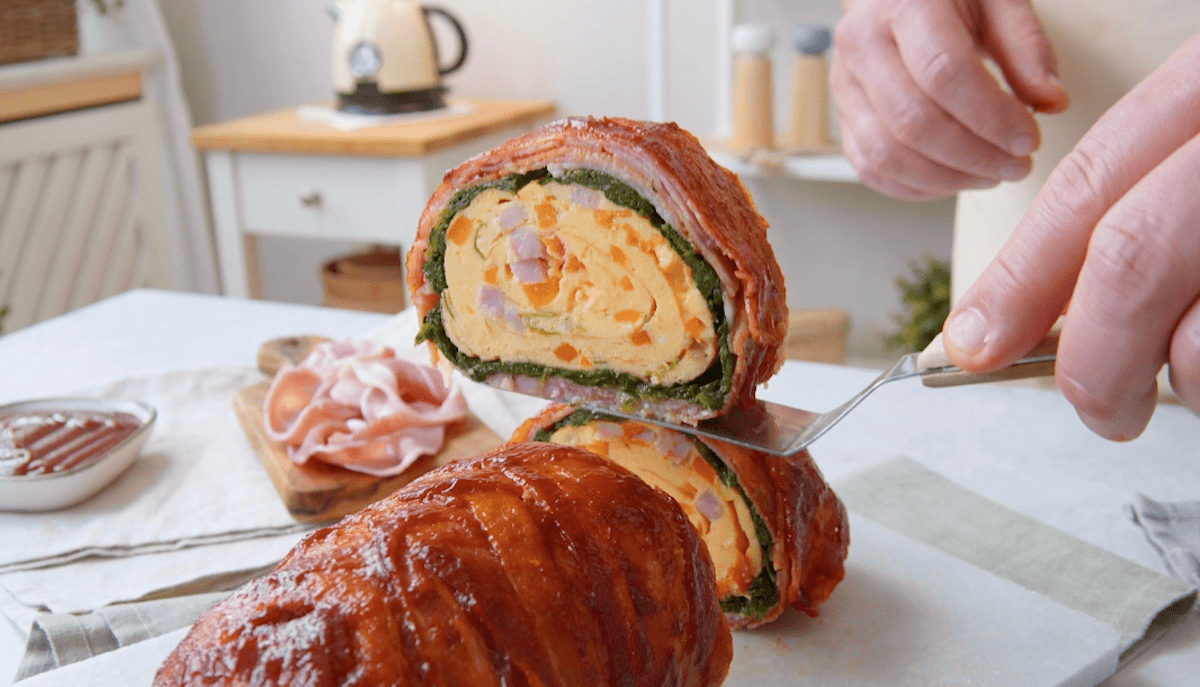 5. Entferne die Frischhaltefolie von der Ei-Spinat-Rolle, lege diese auf den Bacon und schlage sie dann komplett mit dem Bacon ein.