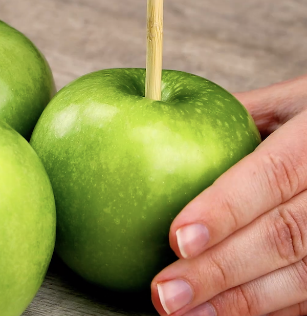1.) Wasche die Äpfel sorgfältig ab, reibe sie anschließend gründlich trocken und entferne die Stielansätze. Dann steckst du jeweils in jeden Apfel einen Holzspieß. Beginne dabei auf der Seite, wo vorher der Stiel war.