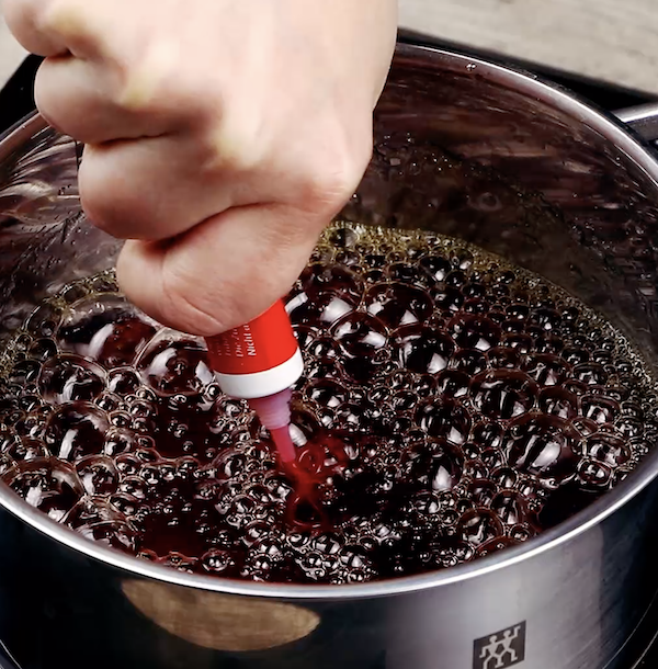 2.) Gib das Wasser zusammen mit Zucker und Zitronensaft in einen Topf und lass diese Mischung auf dem Herd karamellisieren. Wenn du ein Kochthermometer nutzt, solltest du circa 110 °C anpeilen. Jetzt fügst du die Lebensmittelfarbe hinzu.