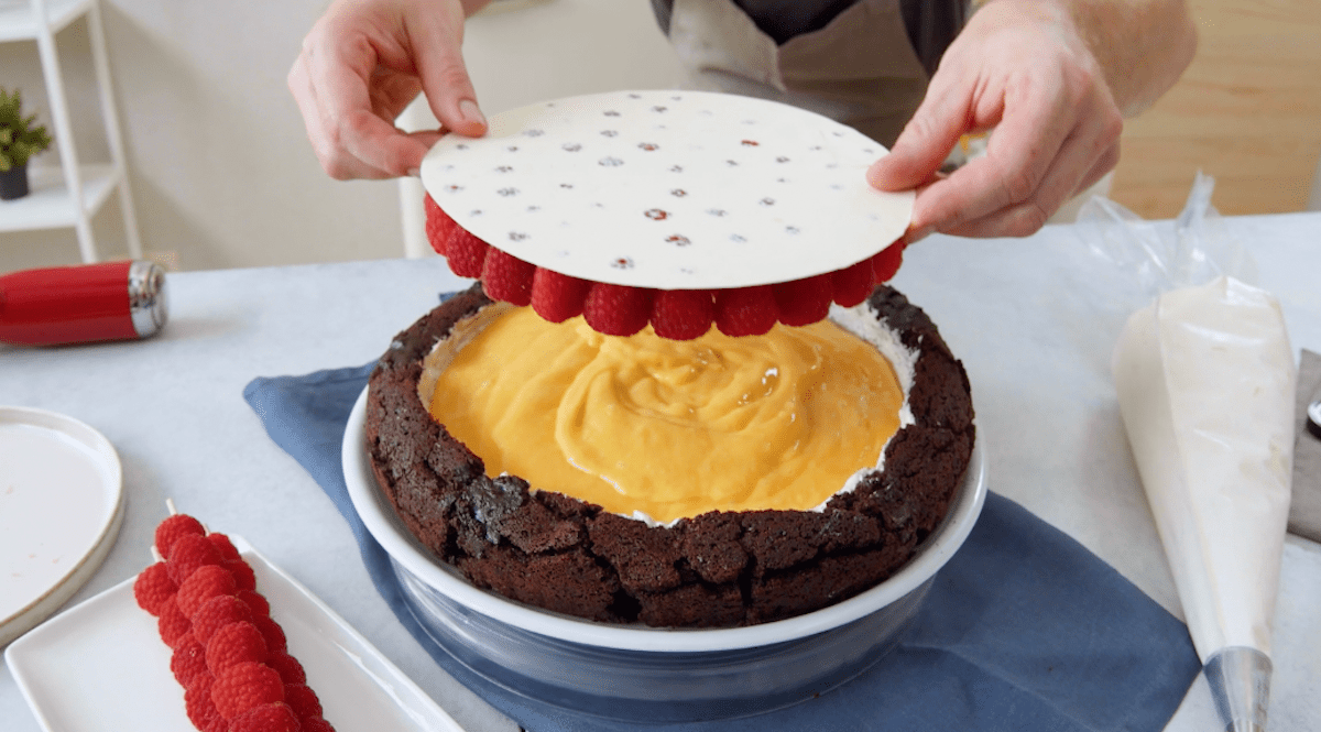8. Lege die Schoko-Himbeer-Platte vorsichtig auf die Mangocreme.