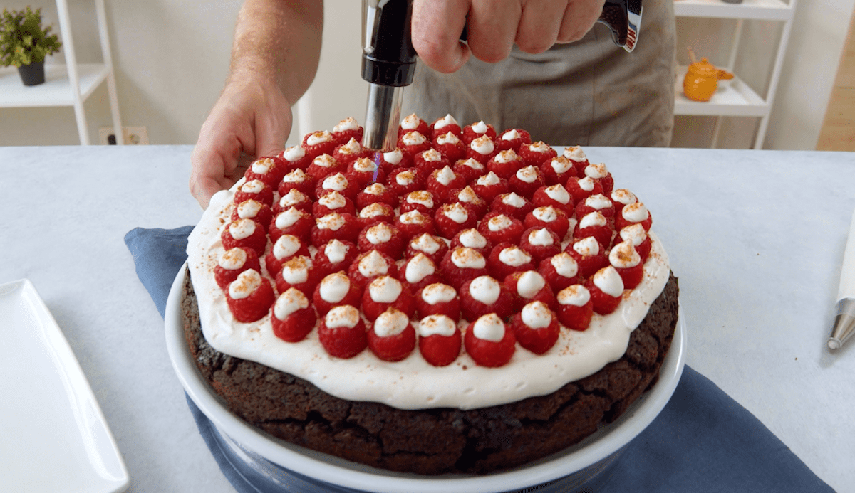 10. Platziere die Himbeeren auf der Creme und garniere die Früchte ebenfalls mit Frischkäsecreme. Streue noch etwas braunen Zucker über die Himbeeren und karamellisiere ihn mit einem Bunsenbrenner.