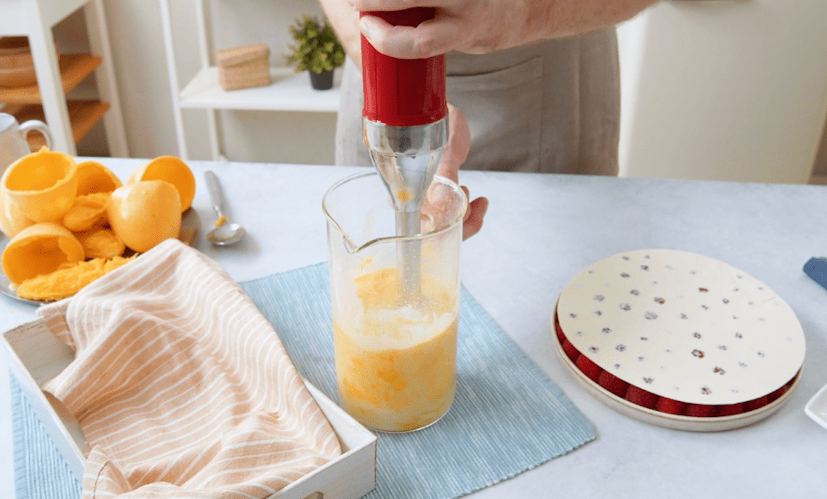 4. Schäle die Mangos, löse ihr Fruchtfleisch vom Kern und püriere es mit Kokosmilch cremig. Lass die Creme ca. 1 Stunde im Kühlschrank durchkühlen.
