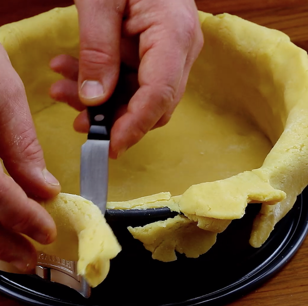 2.) Lege den Teig in eine Springform und schneide den überstehenden Rand ab. Gib die Form danach für 20 Minuten bei 180 °C Umluft in den Backofen.
