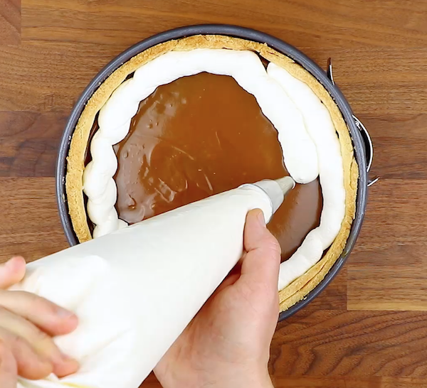 5.) Nach dieser Zeit gibst du die Karamellsoße auf die Schokomasse, dann schlägst du die übrigen 700 Milliliter Sahne steif und gibst etwa die Hälfte davon aufs Karamell.
