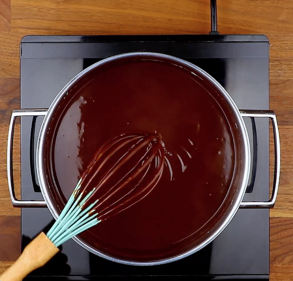 3.) In der Zwischenzeit erhitzt du 800 Milliliter Schlagsahne und fügst die zerkleinerte Zartbitterkuvertüre hinzu. Rühre, bis die Schokolade vollständig aufgelöst ist. Die Masse wird dabei nicht aufgekocht!