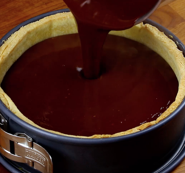 4.) Gieße die Schokosahnemasse in den fertiggebackenen Boden und platziere diesen dann für fünf Stunden im Kühlschrank, damit sich die Schokomasse verfestigt.