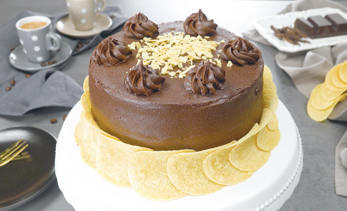Folgendes Rezept erscheint auf den ersten Blick vielleicht ein bisschen abenteuerlustig, aber du wirst erstaunt sein, wie gut vermeintlich nicht zusammenpassende Komponenten letztendlich doch miteinander harmonieren. In diesem Fall Schokolade und Kartoffelchips. Wir backen einen Schokokuchen, stapeln diesen abwechselnd mit einer schokoladigen Frischkäsecreme und verteilen überall Kartoffelchips. So wird der Kuchen ganz besonders crunchy. Eigentlich ist dieser Kuchen final betrachtet einfach eine perfekte salzig-süße Geschmackskombination.