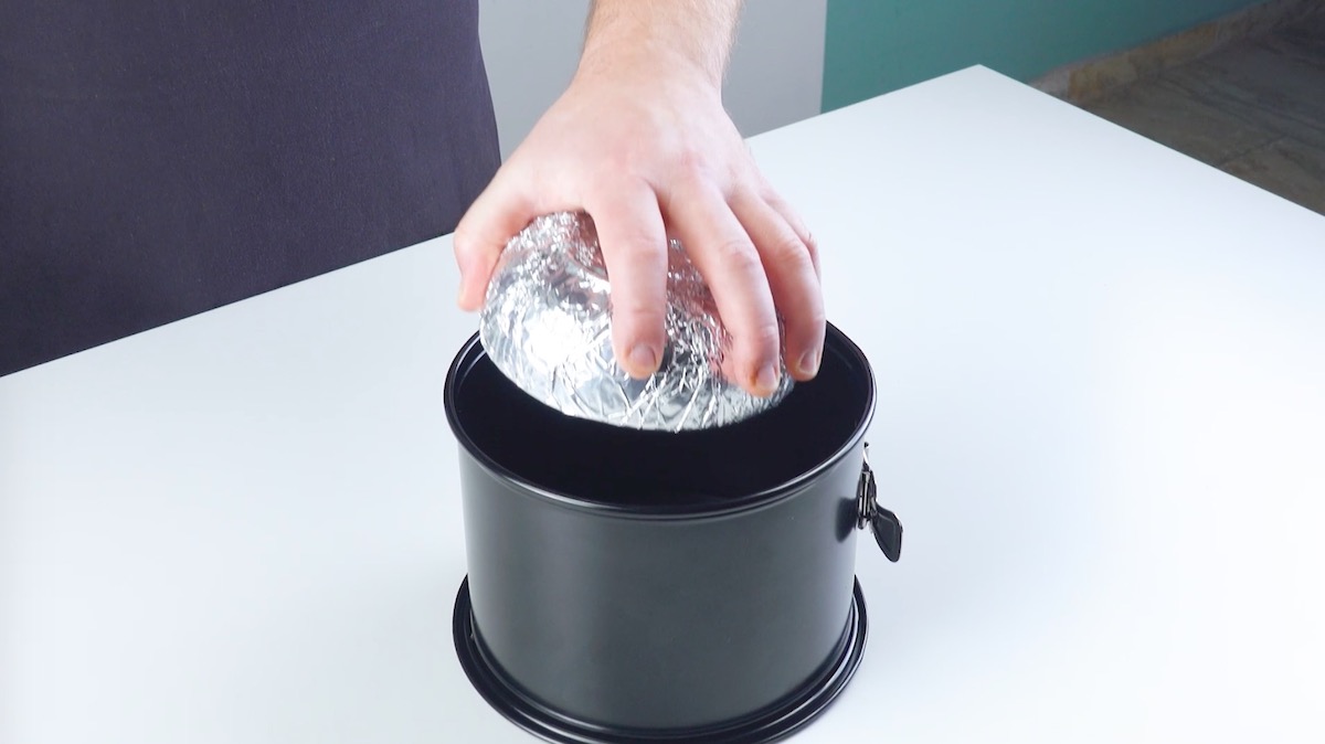 Fülle eine kleine Schale mit trockenen Erbsen. Umwickle die Schale mit Alufolie und stelle sie mittig und mit der Öffnung nach unten in eine eingefettete Springform.