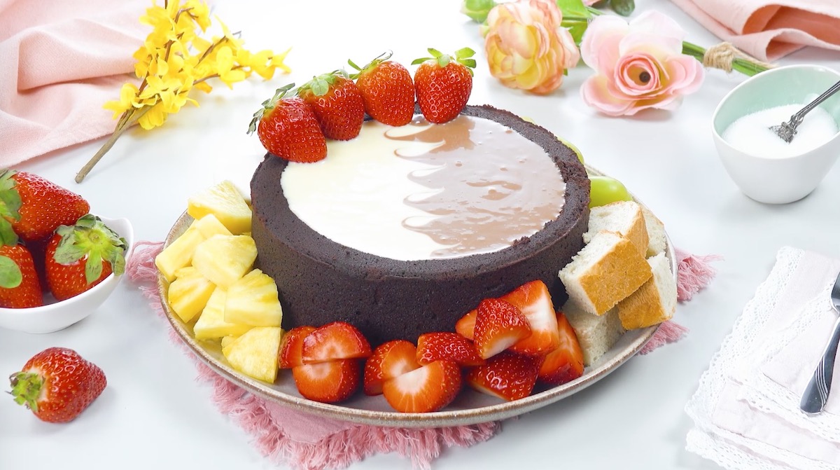 Naschkatzen, aufgepasst: Schokofondue muss nicht ausschließlich in einem Keramiktopf serviert werden! Das beliebte Dessert schmeckt nämlich auch aus einem Schokoladenkuchen hervorragend.