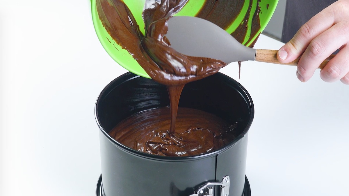 1. Vermenge für den Schokoladenkuchen zunächst heißes Wasser und Kakaopulver miteinander. Schlage die Mischung dann zusammen mit Zucker, Eiern und Öl auf; rühre abschließend Mehl und Backpulver unter.