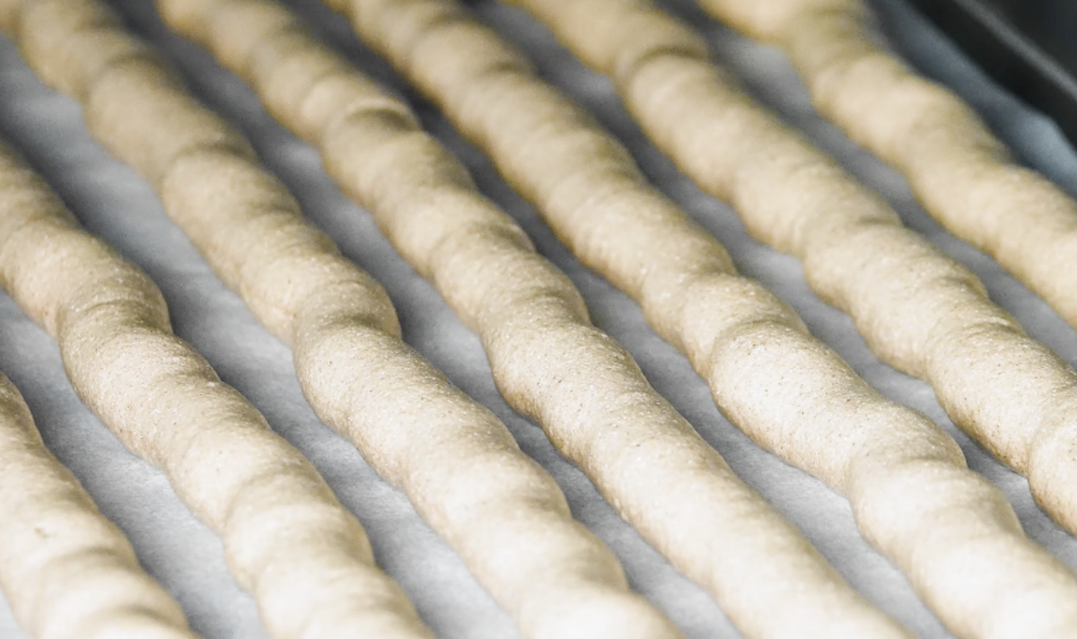 3. Heize den Ofen auf 140 °C Umluft vor und lege 2 Backbleche mit Backpapier aus. Fülle den Eischnee in einen Spritzbeutel (mit glatter 0,5-cm-Düse) und spritze einzelne Linien längs auf das Backblech (mit ca. 1 cm Abstand zueinander). Stelle das Blech ungefähr eine Stunde in den Ofen. Wenn das Baiser knusprig gebacken ist, ist es fertig. Lasse die Baiser-Sticks auf Raumtemperatur abkühlen.