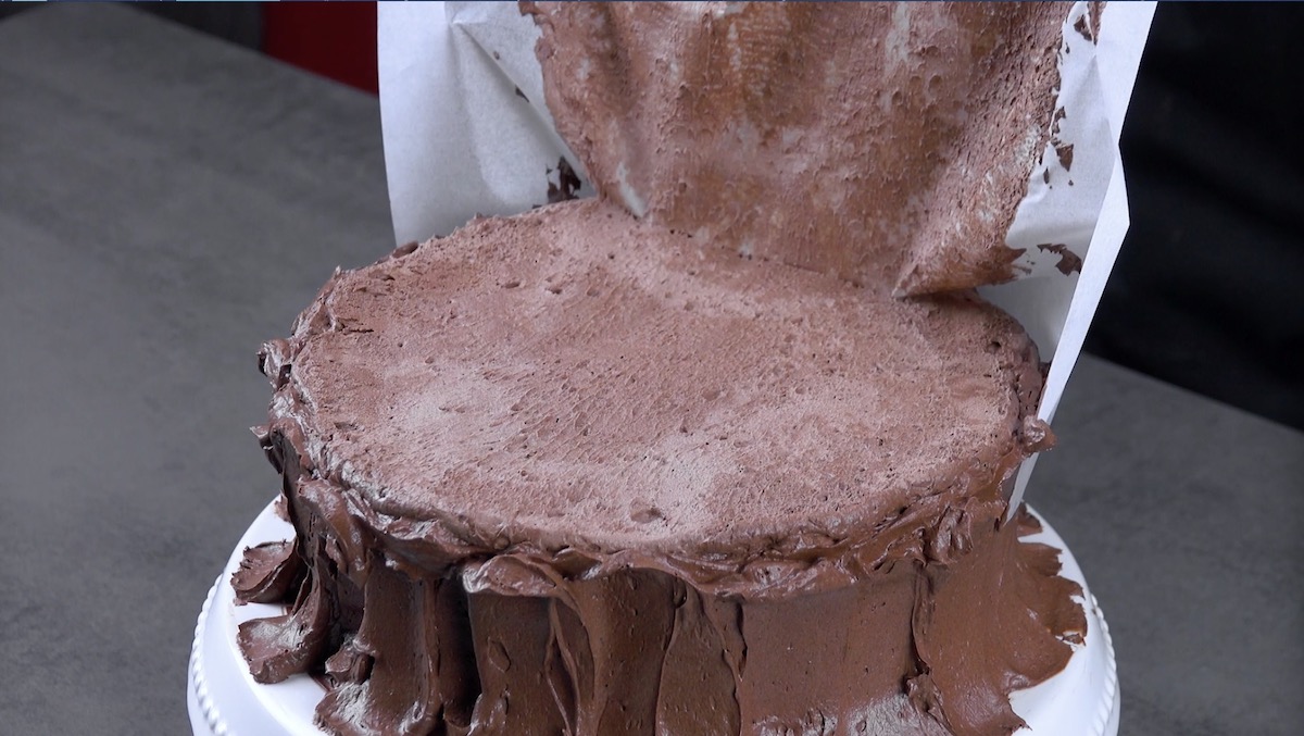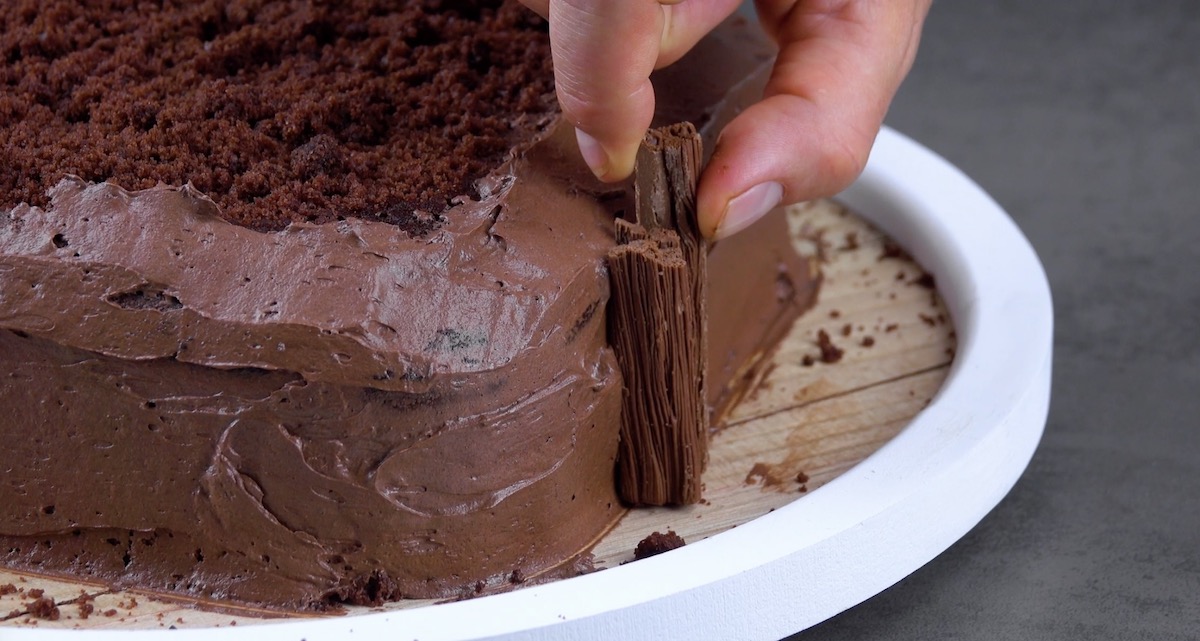 3.3) Bestreiche die Ränder des Kuchens mit Schoko-Buttercreme und drücke daran die Borkenschokolade fest, die als Umzäunung für die Ausgrabungsstätte dient.
