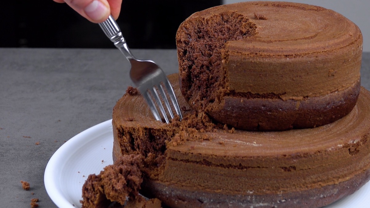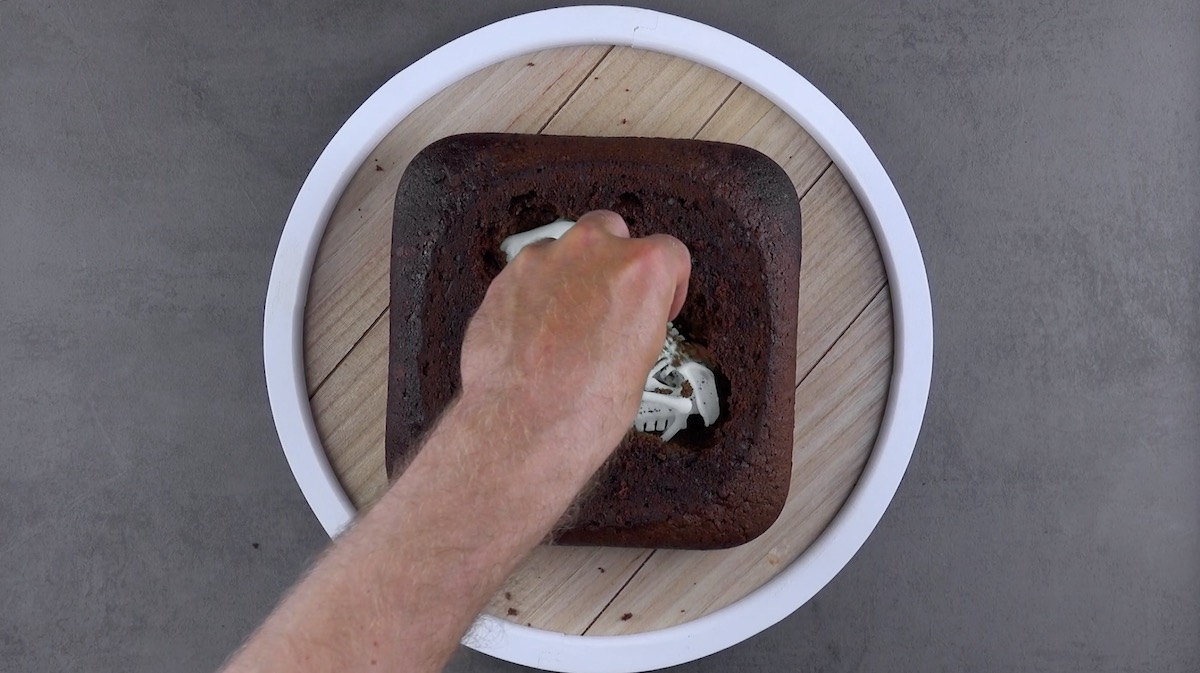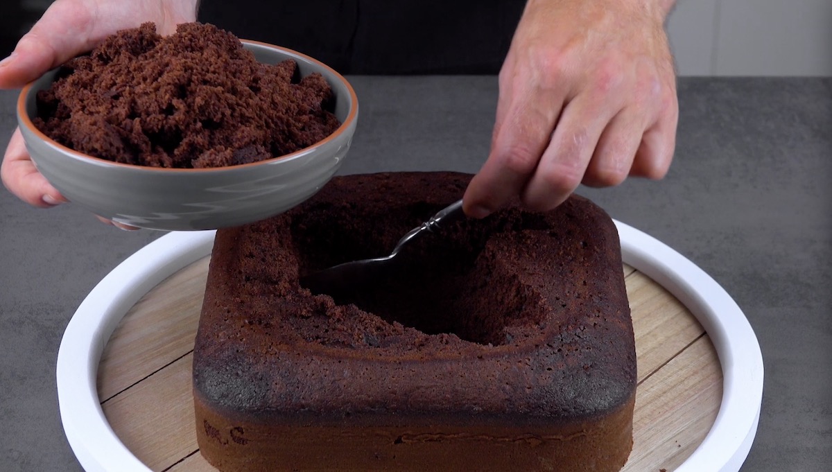 So geht es: 1.1) Backe beide Schokoladenkuchen und lass sie komplett auskühlen, bevor du sie aus der Form nimmst. Staple dann beide kopfüber aufeinander und kratze mit einer Gabel einen „Steinbruch“ heraus.