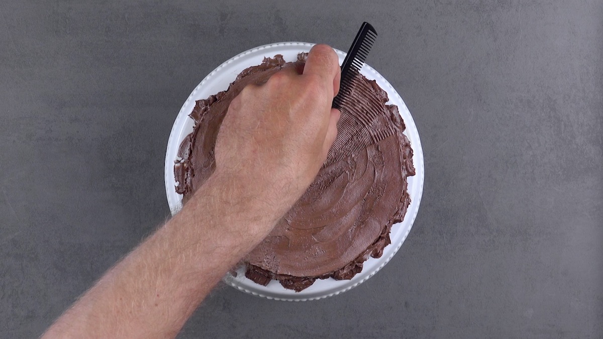 2.4) Nimm einen sauberen Kamm und zeichne damit Baumringe oben auf den Kuchen.