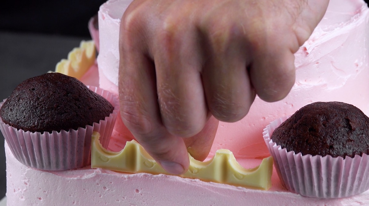 4.4) Schneide die weißen Schokoladentafeln zu Fenstern, Türen und Zinnen zurecht und dekoriere damit das Schloss. Tipp: Die Zinnen kannst du ganz einfach mit einem Flaschendeckel aus der zimmerwarmen Schokolade ausstechen.