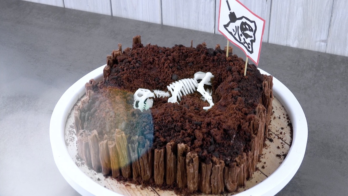 3.4) Entferne die Creme von den Oreos uns zerbrösele die Kekse. Bestreue damit und mit den übrigen Krümeln aus dem Loch den Kuchen. Lege anschließend das Skelett mit einem Pinsel etwas frei oder puste die Krümel vorsichtig zur Seite. Dekoriert mit einer selbstgebastelten Fahne sieht dieser leckere Kuchen tatsächlich aus wie eine Ausgrabungsstätte, die kleine Archäologen faszinieren wird.