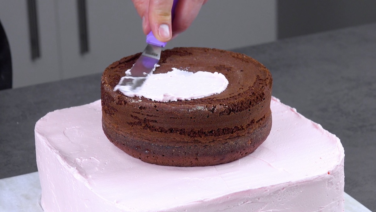 4.2) Setze den runden Schokoladenkuchen auf den rechteckigen und streiche auch ihn mit Erdbeer-Buttercreme ein.