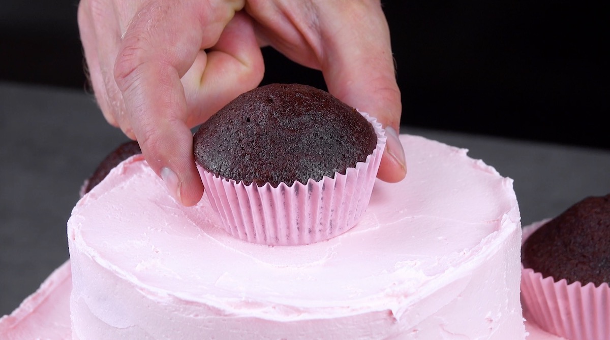 4.3) Platziere je einen Schokoladenmuffin auf den Ecken des rechteckigen Kuchens und setzte den letzten Muffin oben auf den runden Kuchen.
