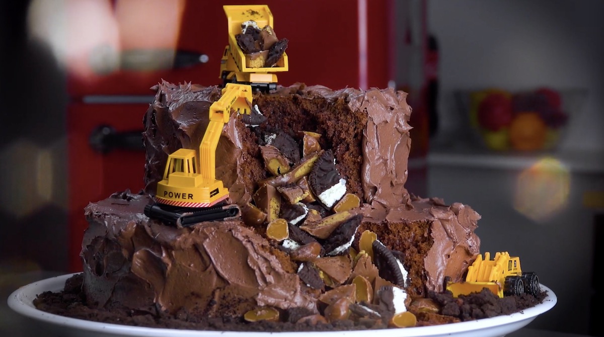 1.4) Zerkleinere nun zum Abschluss nach Belieben ein paar Oreos, Karamelldrops und Reeses’s und platziere sie als „Geröll“ in der zuvor herausgekratzten Stelle. Dekoriere die Baustelle zum Abschluss mit Spielzeugfahrzeugen – fertig ist der Baustellen-Kuchen, der die Herzen kleiner Jungs garantiert schneller schlagen lässt.