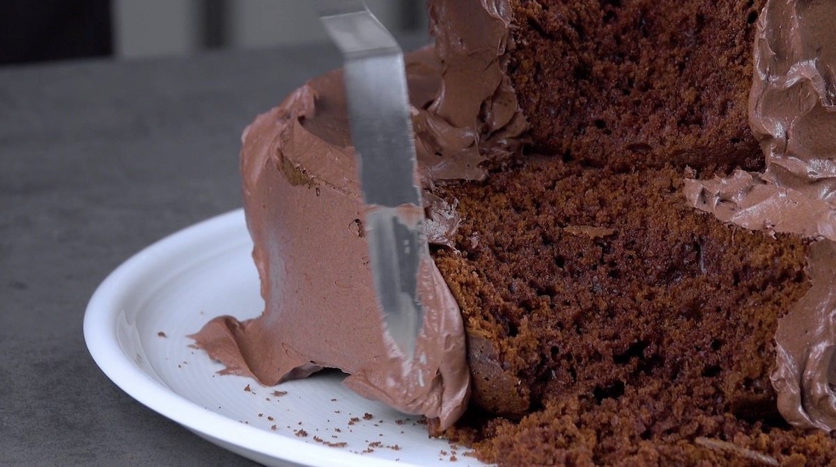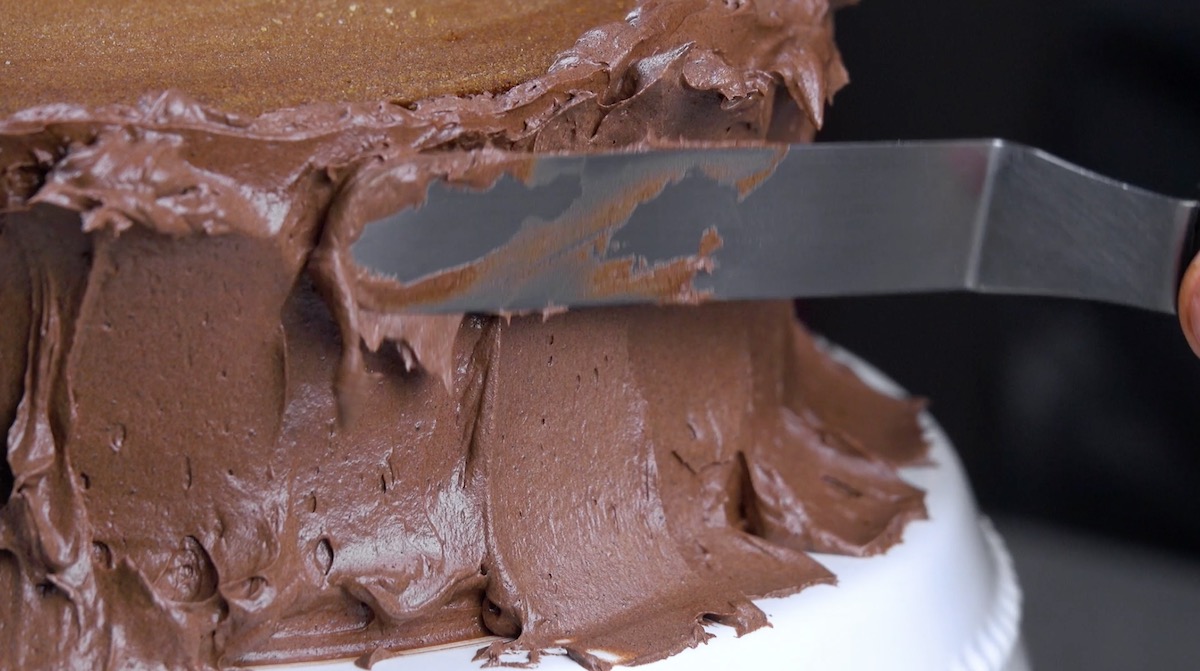 2.2) Stelle den Schokoladenkuchen kopfüber auf und bestreiche die Seiten von unten nach oben mit Zartbitterschoko-Buttercreme.
