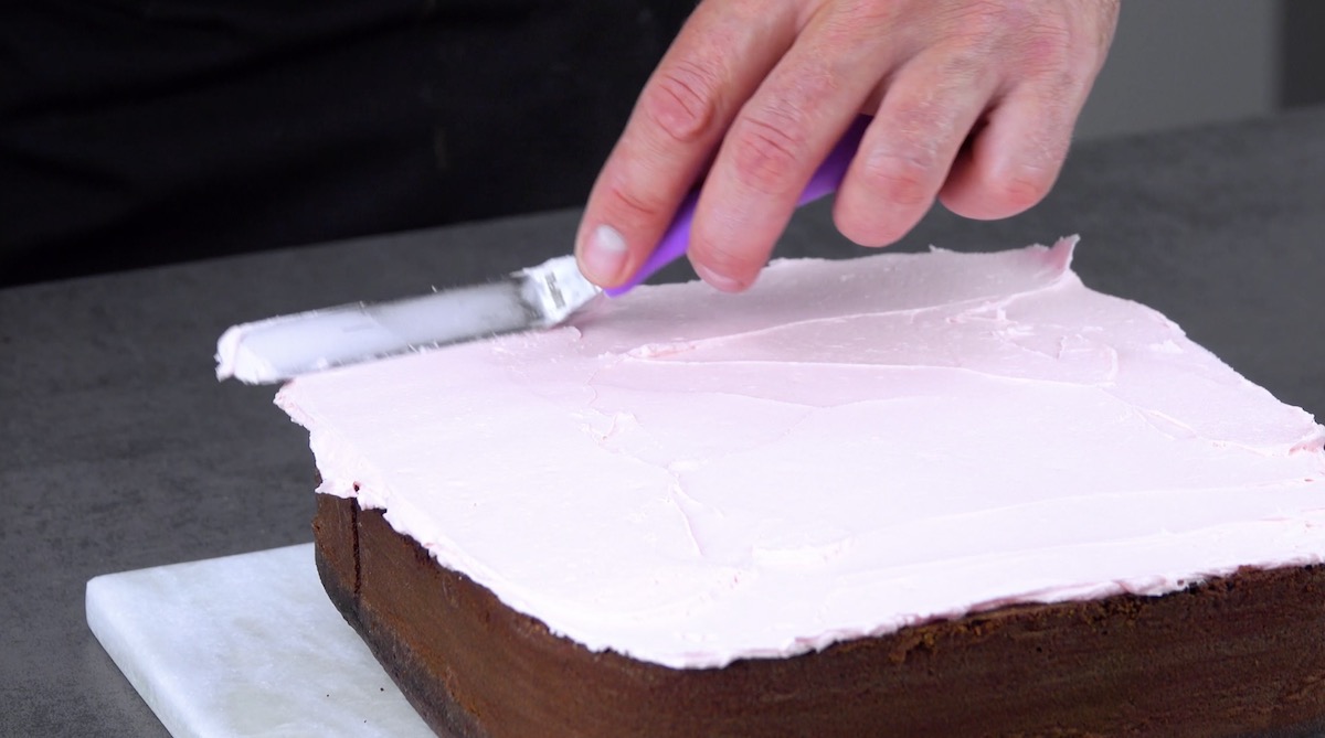 So geht es: 4.1) Verrühre die Butter und den Puderzucker zu Buttercreme. Gib dann nach Belieben Erdbeermarmelade hinzu, um der Creme einen fruchtigen Geschmack und eine rosa Farbe zu verleihen. Streiche dann den rechteckigen Schokoladenkuchen mit der Erdbeer-Buttercreme ein.