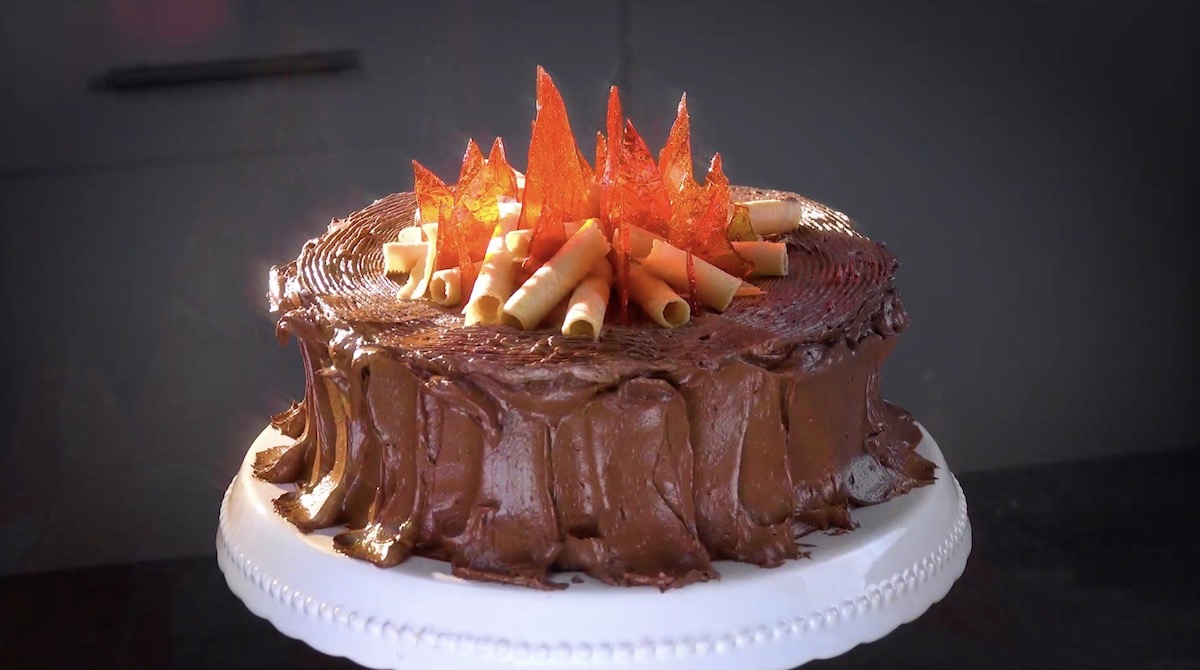 2.5) Halbiere zum Abschluss die Waffelröllchen und platziere sie wie Holzscheite in die Mitte des Kuchens. Brich das Karamell in spitze Ecken auseinander und dekoriere sie als Flammen zwischen die Holzscheite – fertig ist der Lagerfeuer-Kuchen.