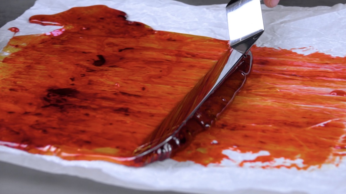 So geht es: 2.1) Breite zuvor zerknülltes Backpapier auf einer ebenen Oberfläche aus. Bringe für das Karamell Zucker und Wasser zum Kochen. Gib anschließend den Honig hinzu und koche das Ganze bis es goldgelb und eingedickt ist. Rühre dann etwas gelbe, rote und orangefarbene Lebensmittelfarbe hinein und verstreiche die heiße Flüssigkeit vorsichtig auf dem Backpapier. Lass das Karamell aushärten.