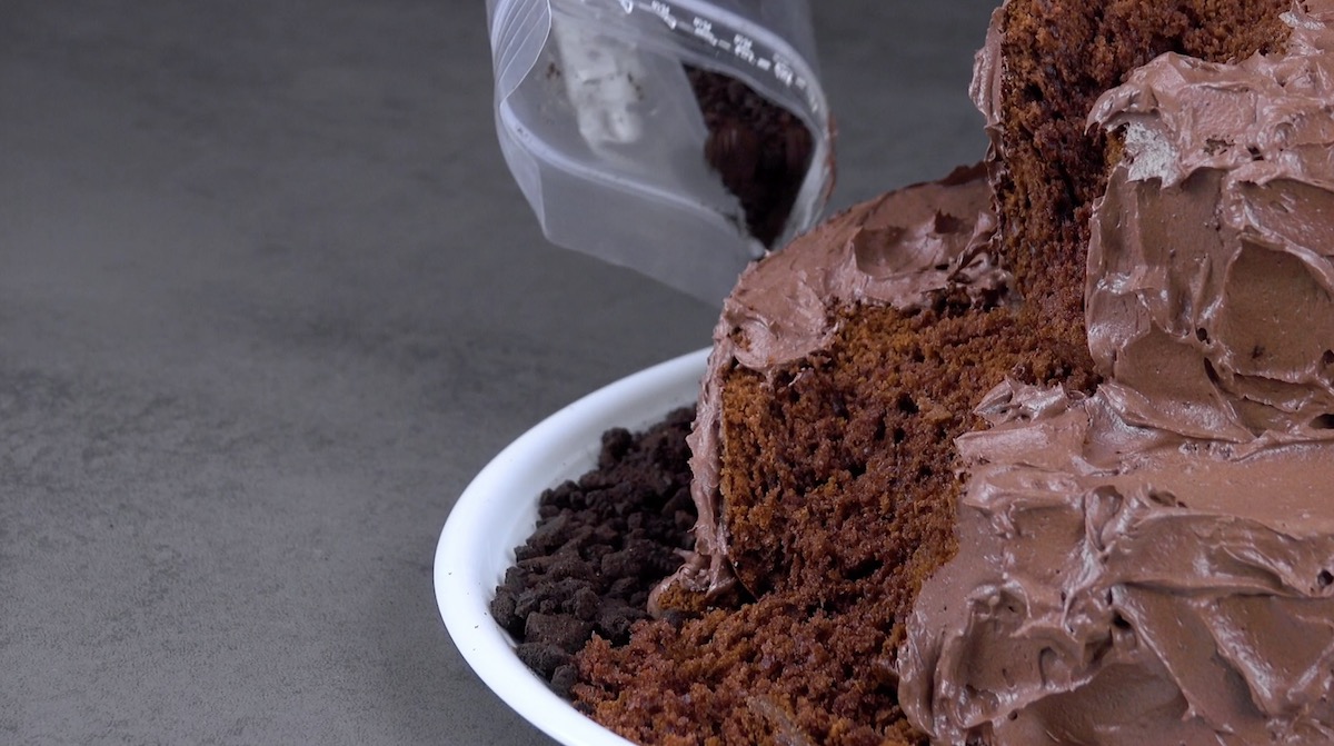 1.3) Entferne von ein paar Oreos die Creme, zerbrösele die Kekse und verteile die Krümel als „Erde“ außen um die Kuchen.