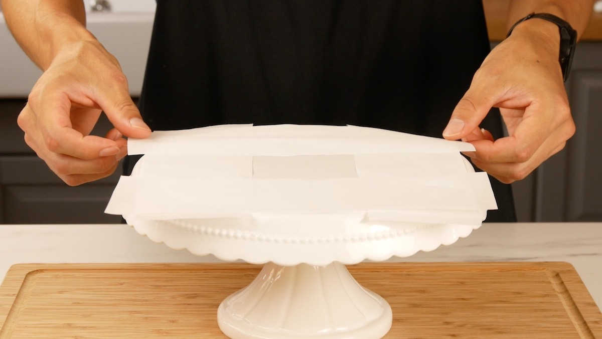 Belege einen Tortenboden an den „Rändern“ mit zurechtgeschnittenen Backpapierstücken. Diese halten den Tortenboden sauber.